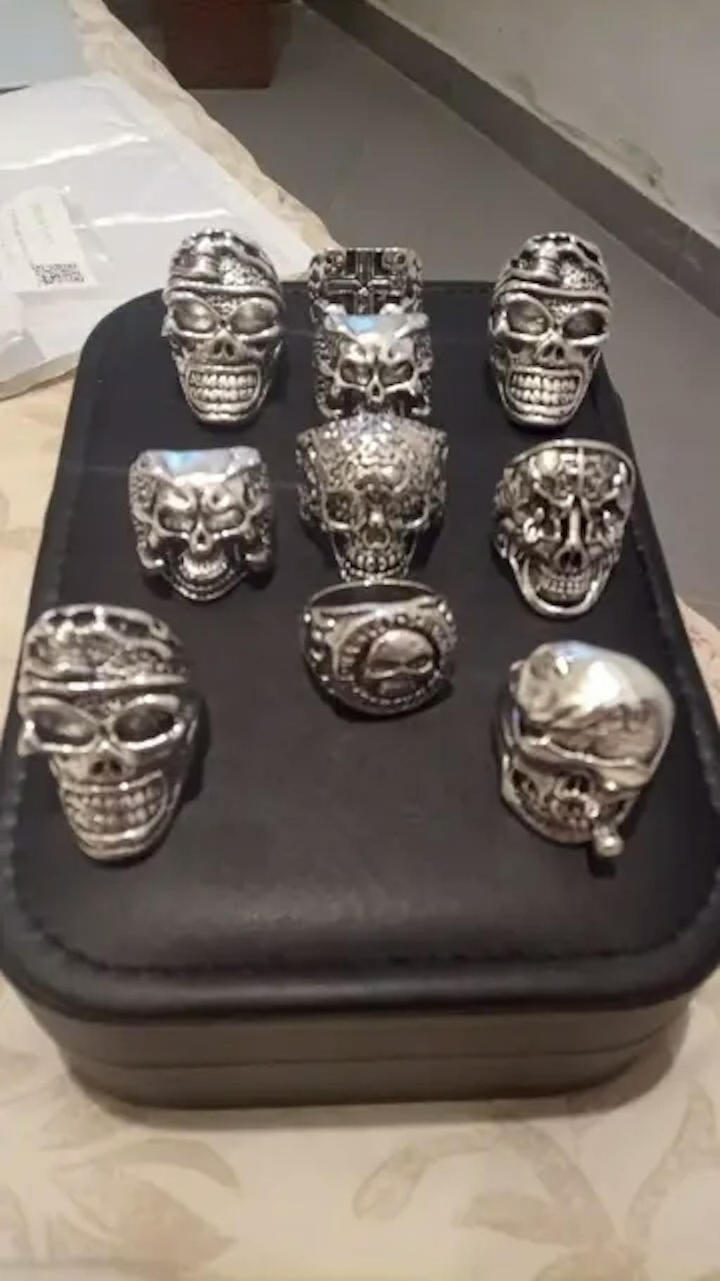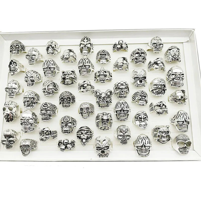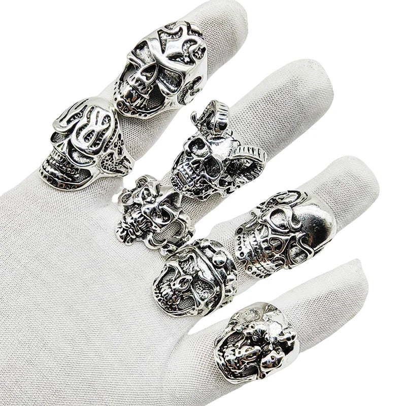 • Set includes 10 assorted skull-themed rings: crosses, hollow skeletons, gothic patterns, and more