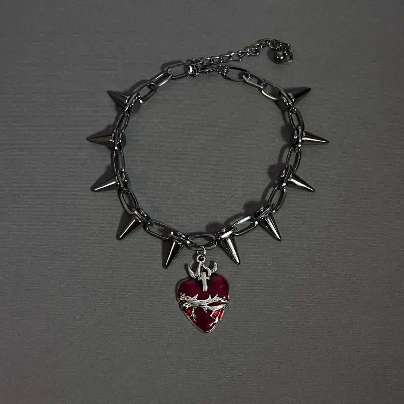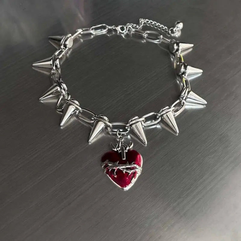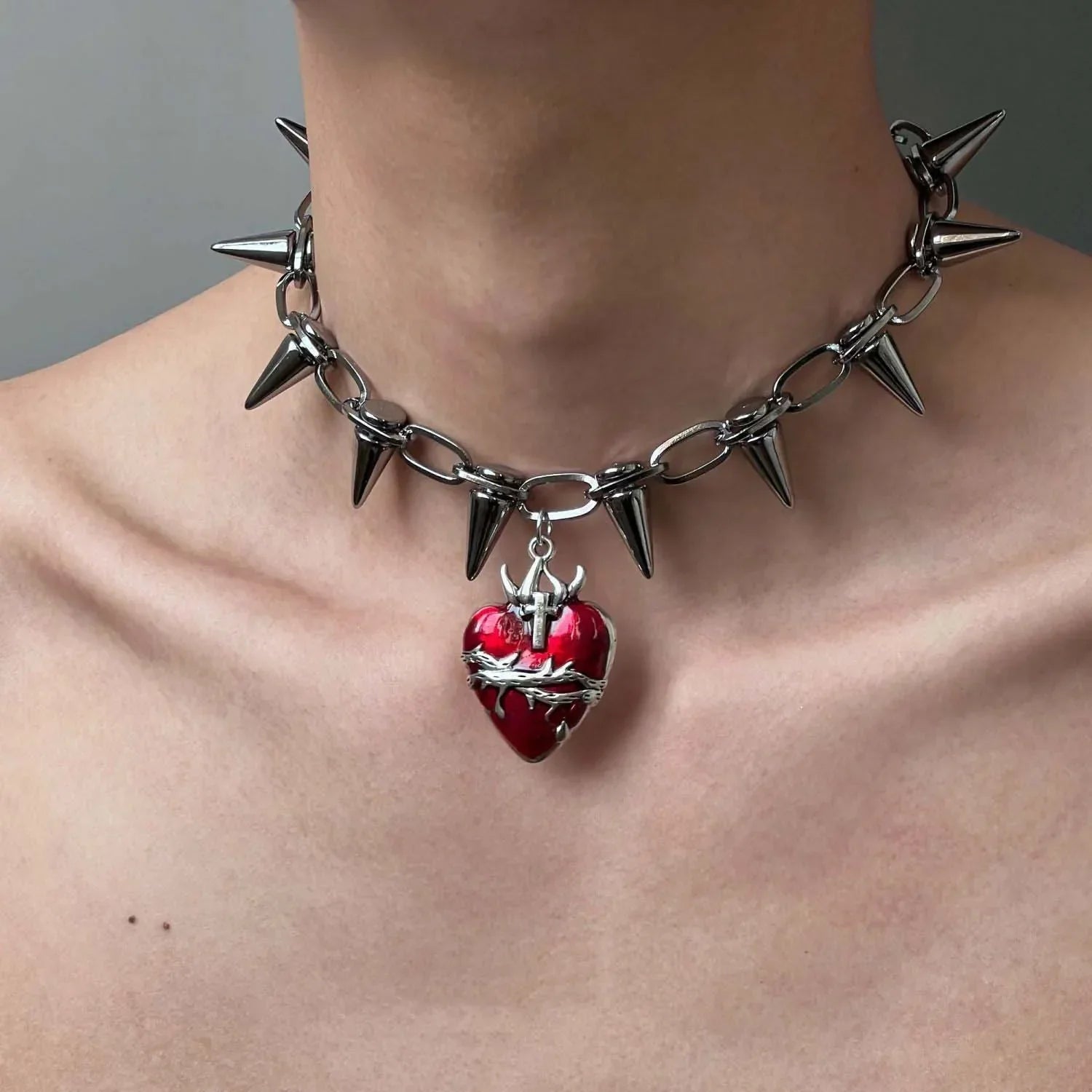 Make a bold fashion statement with this Punk Gothic Thorn Red Heart Necklace — a striking blend of Y2K, hip-hop, and grunge styles featuring metal spikes and a blood-red heart pendant.